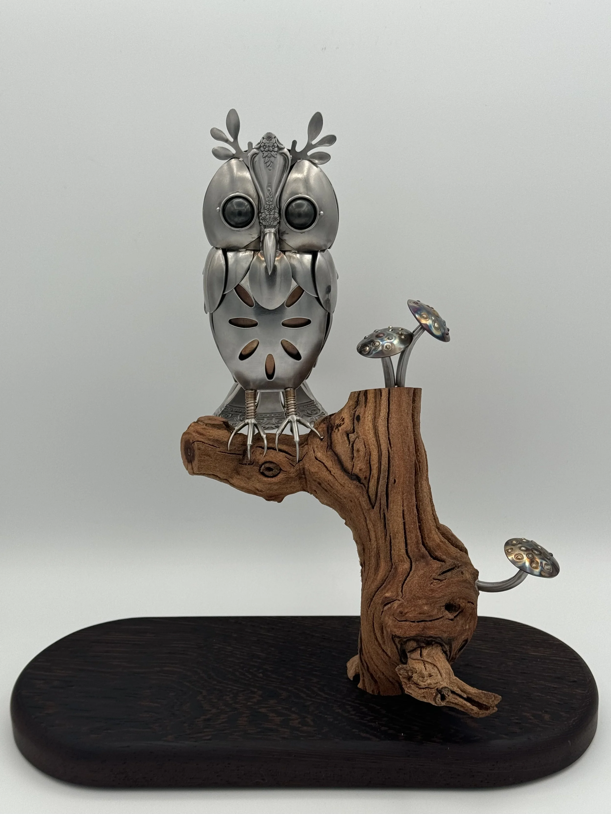 My focus is primarily on creating birds, spiders, cats, and other creatures but is not limited to animals alone. I utilize found objects such as used cutlery, ball bearings, and washers to create my art pieces. The primary material that I choose to work with is Stainless Steel for its shiny appearance, durability, and resistance to rust and corrosion. Stainless steel is frequently used in the medical device industry, which I have been trained in, so it was only natural for me to choose stainless as a medium. I TIG weld a portion of my work, and the finer details are done with a Laser welder, which is used under microscope. I have also recently picked up woodworking for the purpose of making mounts to attach my works to for display. I mainly use exotic hardwoods from Africa, and South and Central America and apply a minimal finishing oil to preserve the natural beauty of the woods.