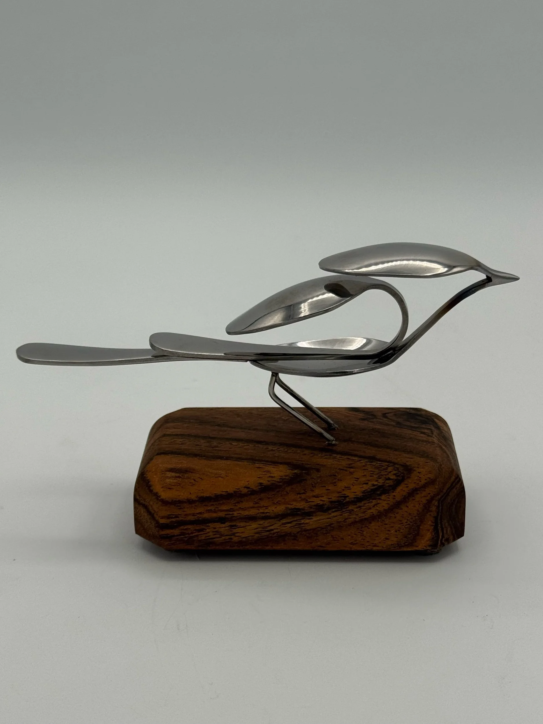Nestlings are small, elegant bird sculptures made from miniature espresso spoons. This bird is Tig and laser welded with clean precision and attached to a Bocote wood mount for a table top display.