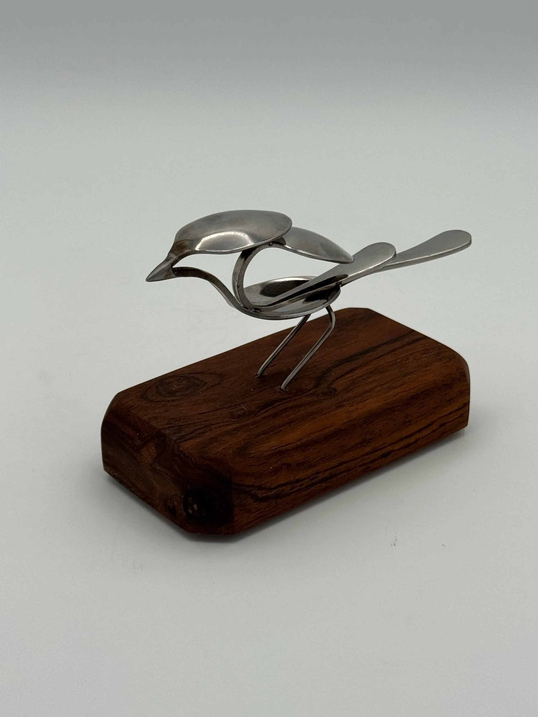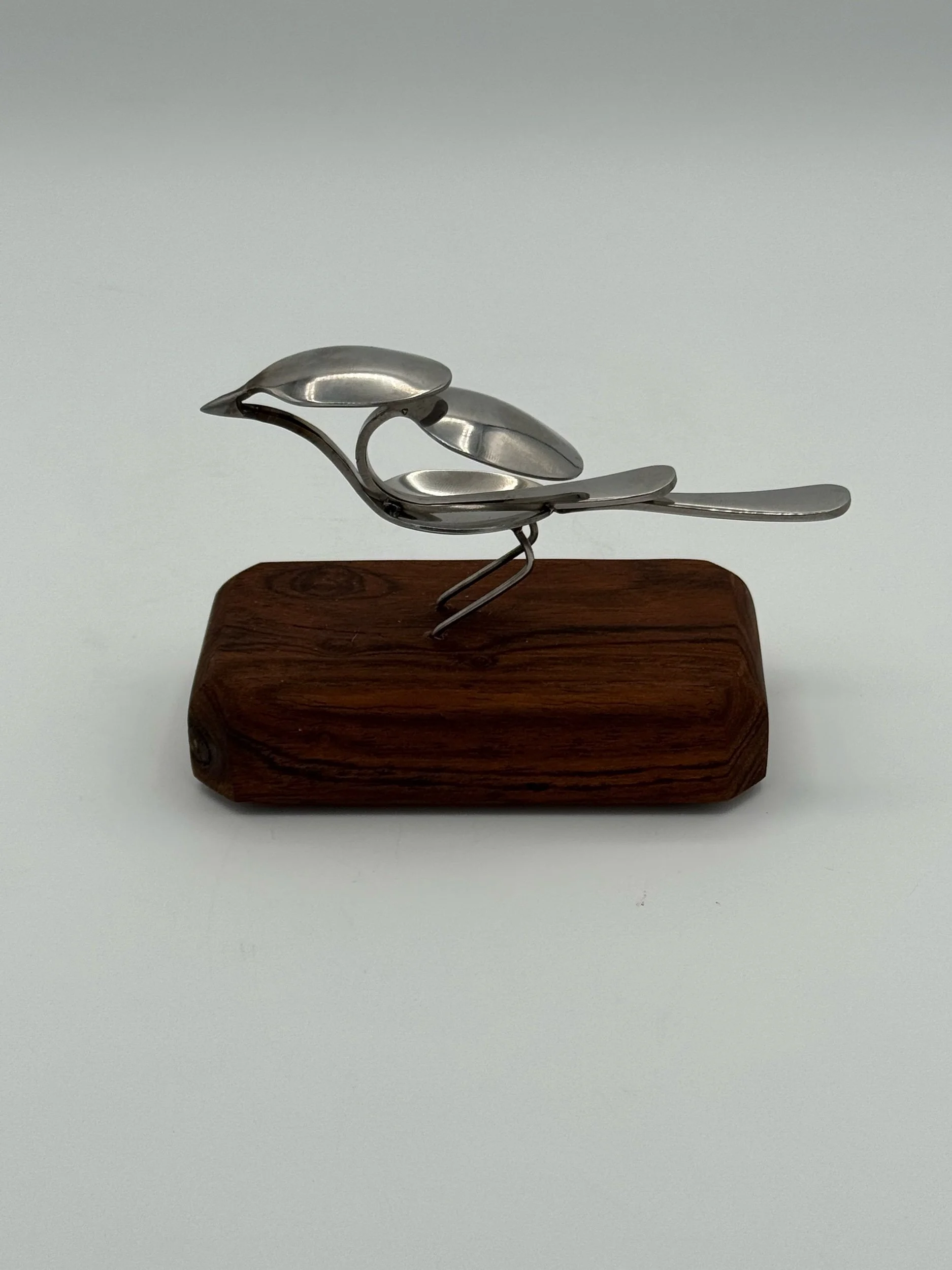 Nestlings are small, elegant bird sculptures made from miniature espresso spoons. This bird is Tig and laser welded with clean precision and attached to a Bocote wood mount for a tabletop display. All steel materials used in my pieces are stainless steel, so they will never rust. All metalworking and woodworking are done exclusively by me.