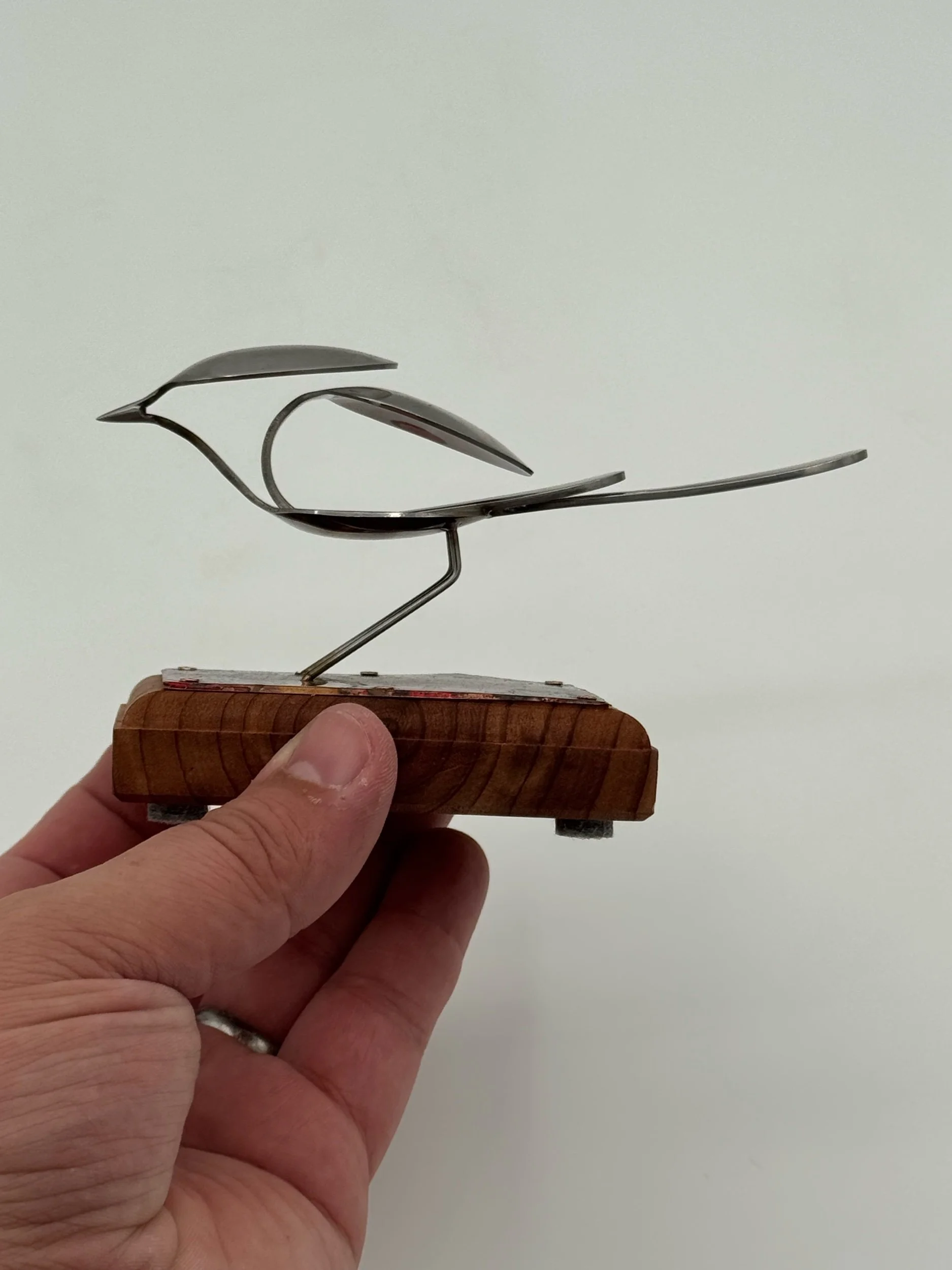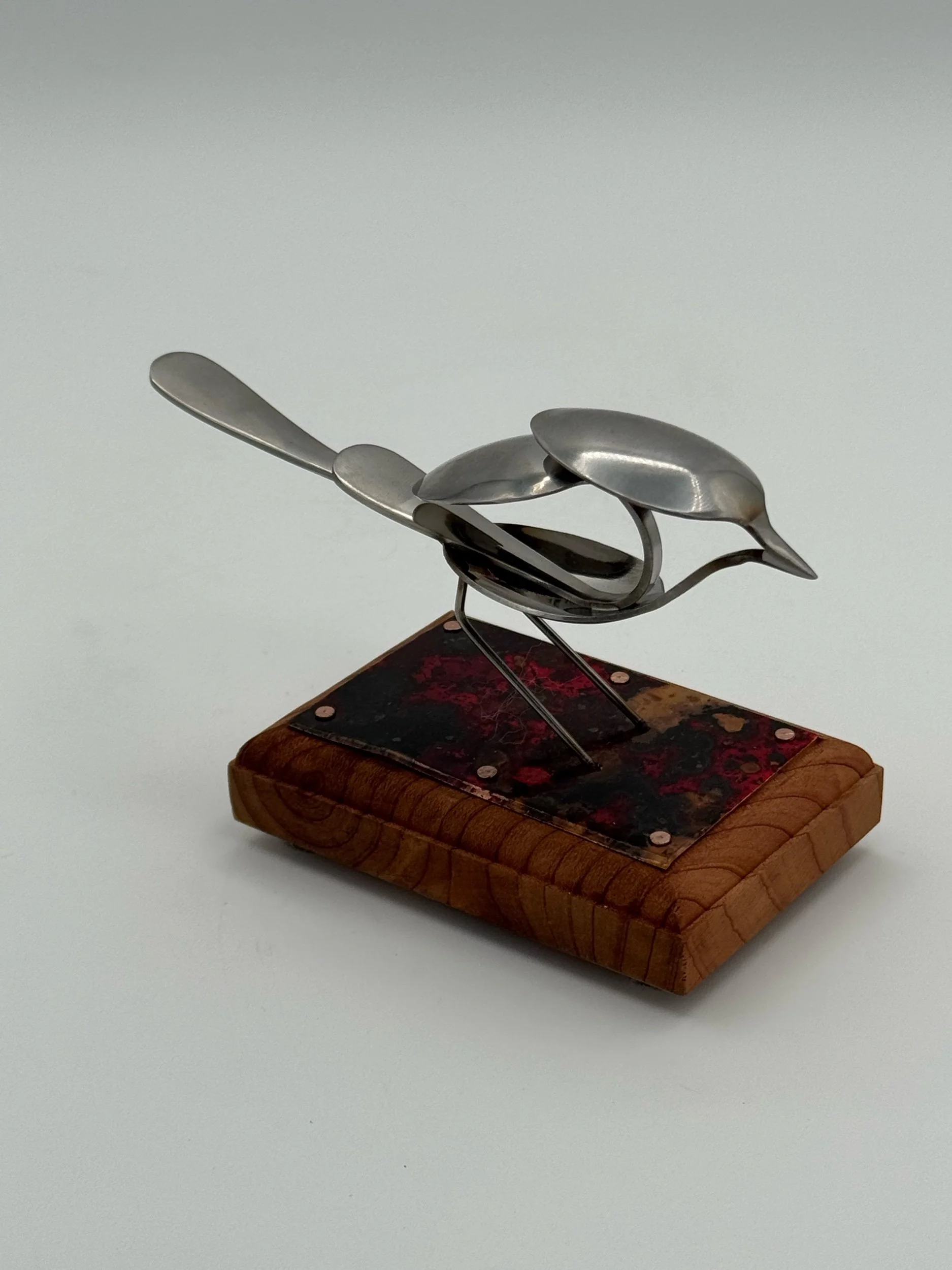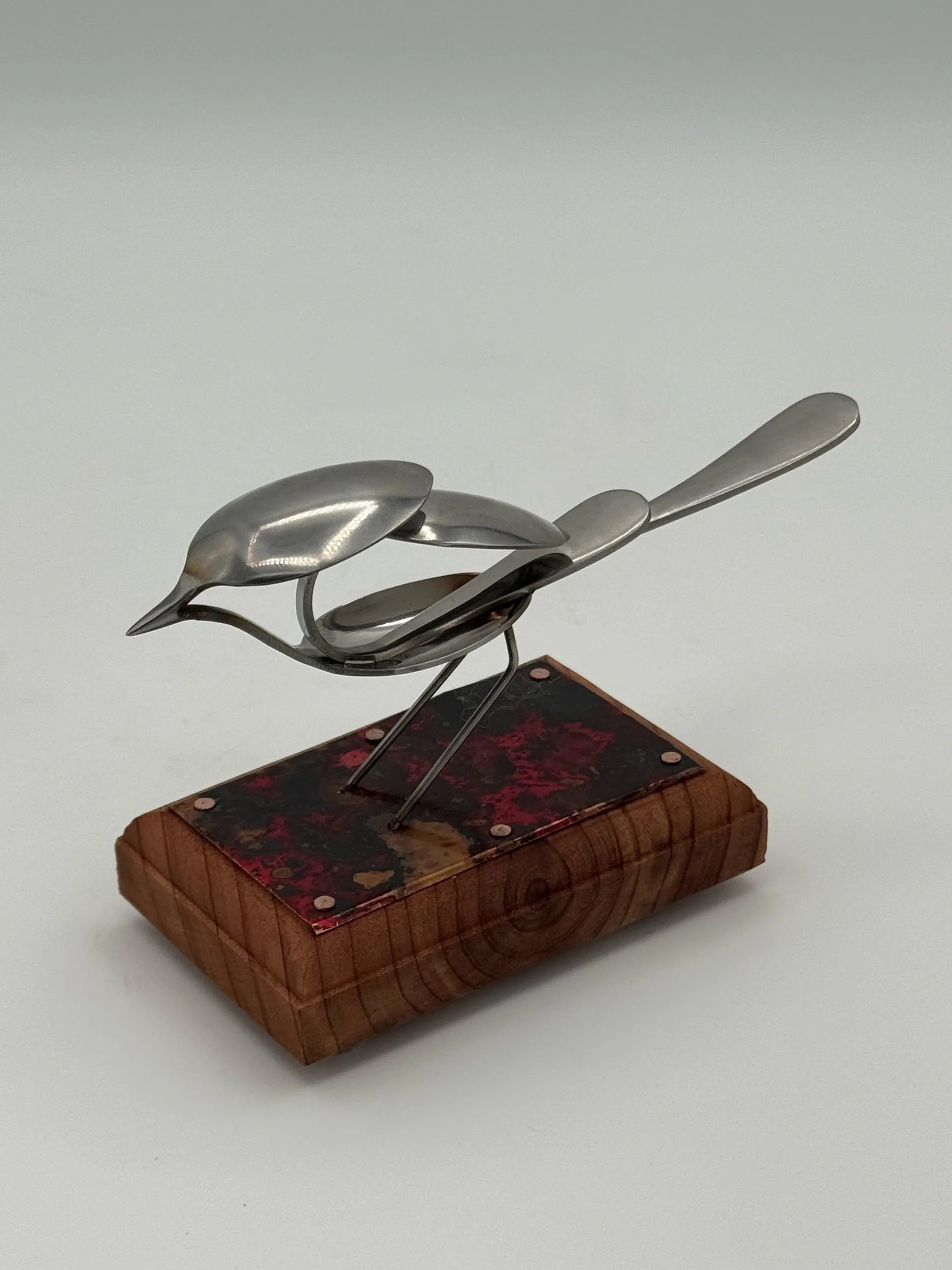 Nestlings are small, elegant bird sculptures made from miniature espresso spoons. This bird is Tig and laser welded with clean precision and attached to a Cedar mount with a red patina copper surface for a tabletop display. All steel materials used in my pieces are stainless steel, so they will never rust. All metalworking and woodworking are done exclusively by me.