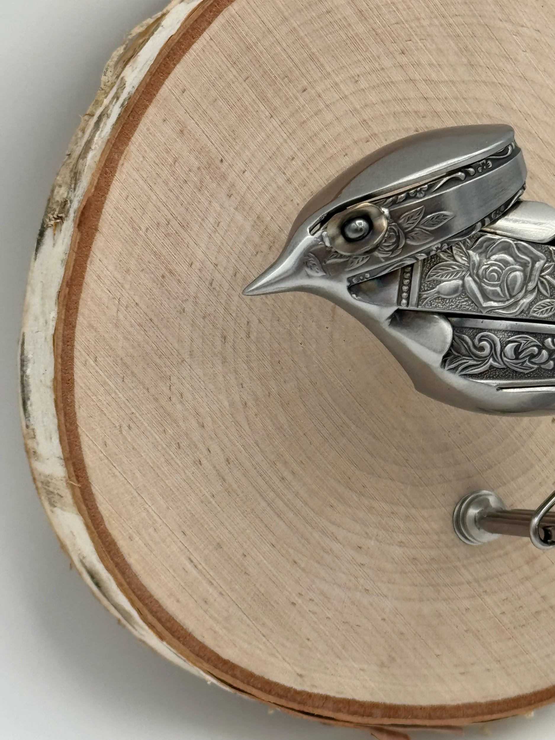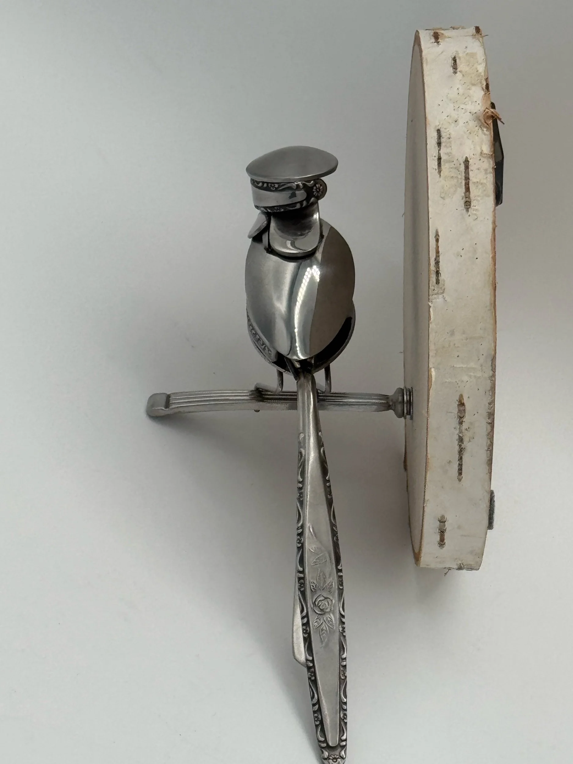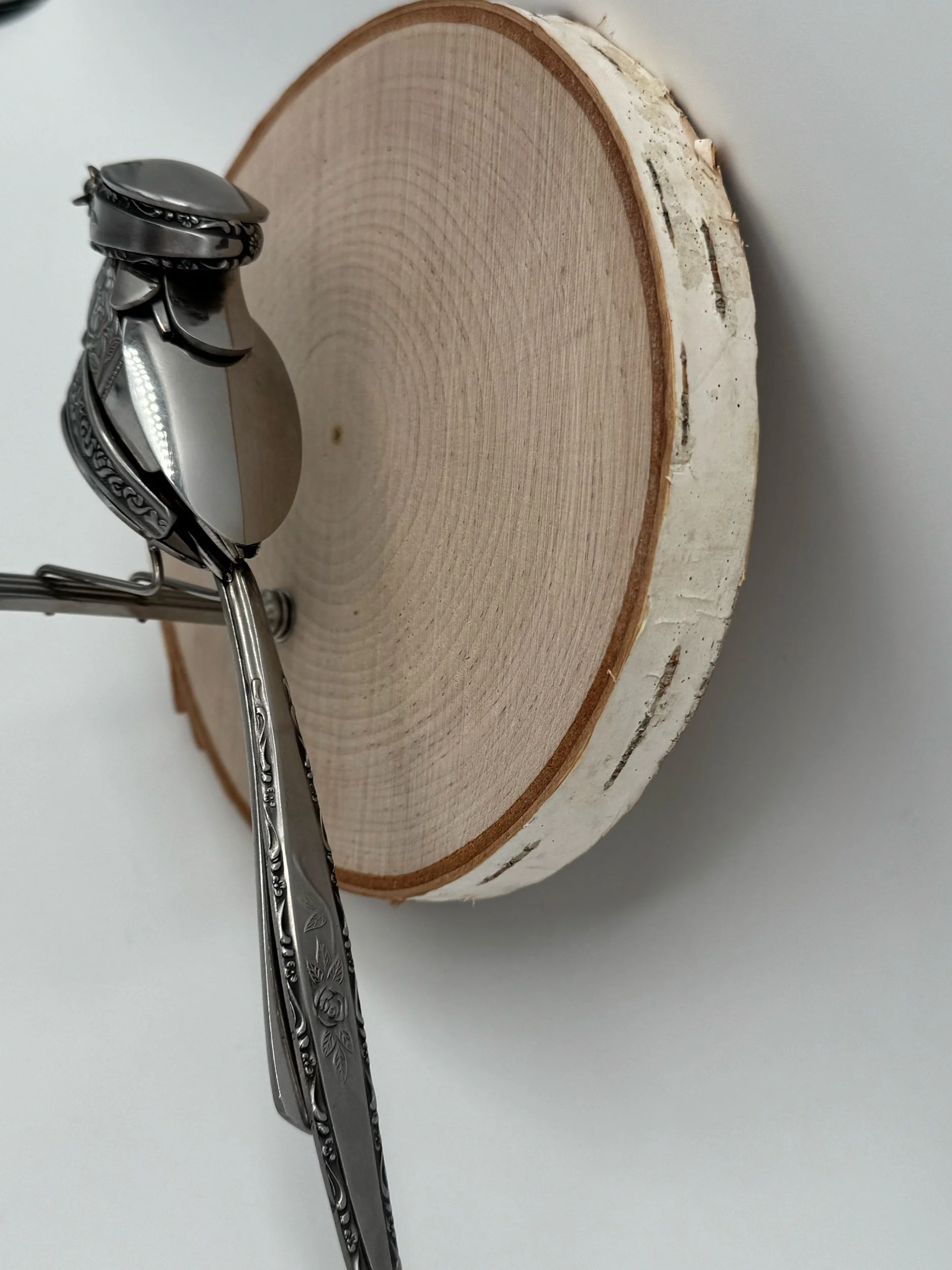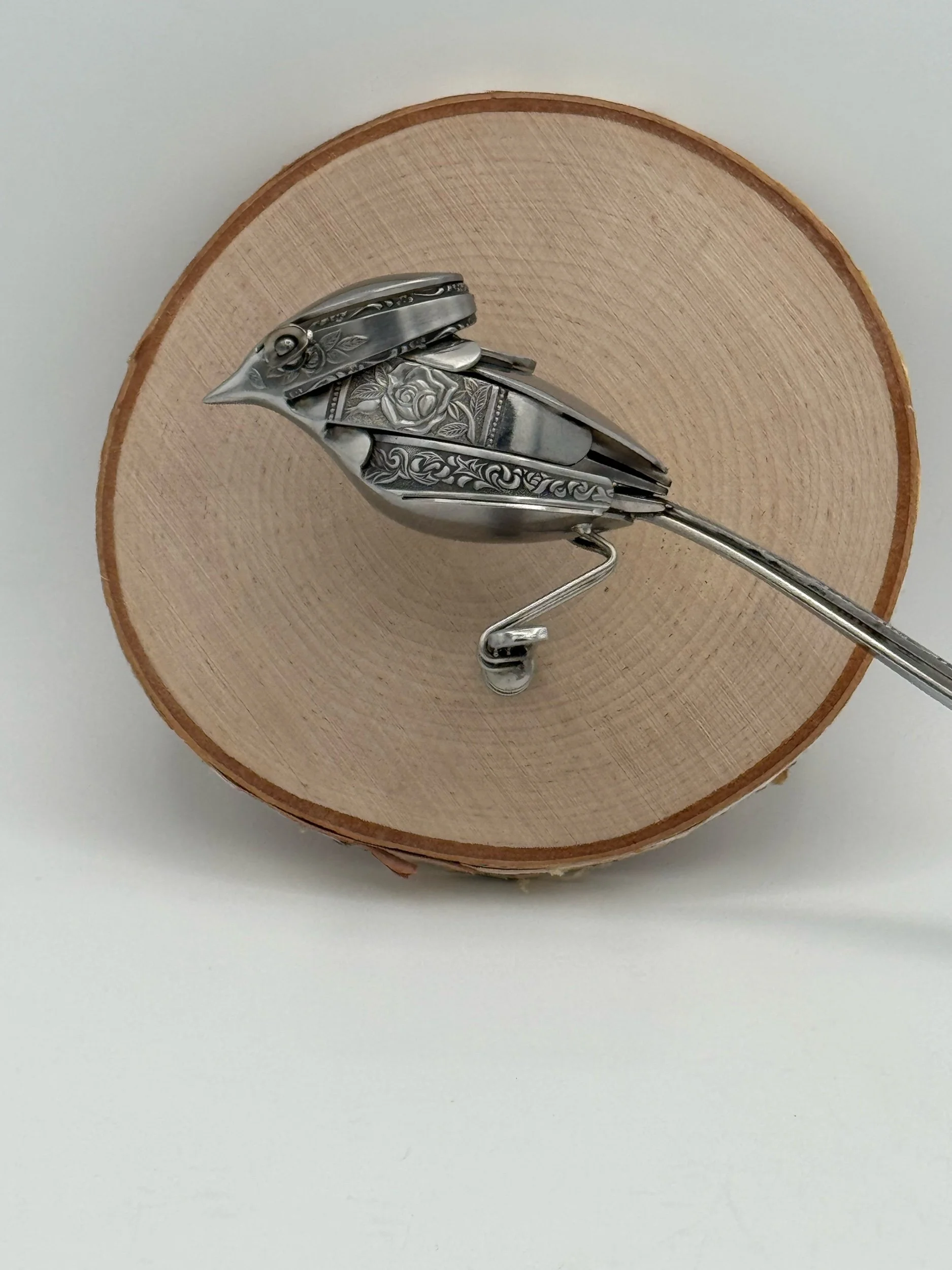 "Crinkle" is a bird sculpture made from upcycled stainless steel cutlery. Made with multiple different intricate patterns of vintage stainless cutlery.