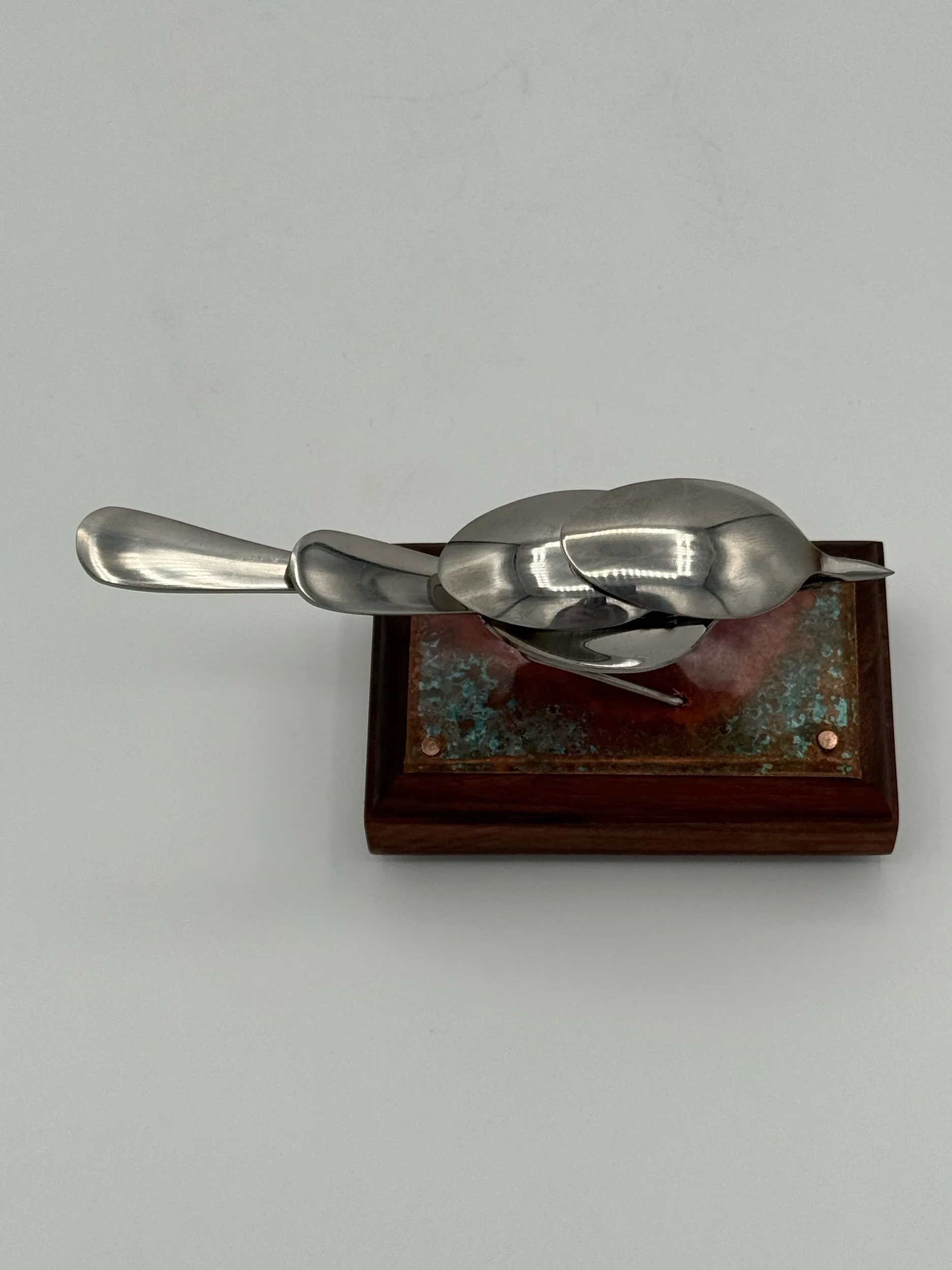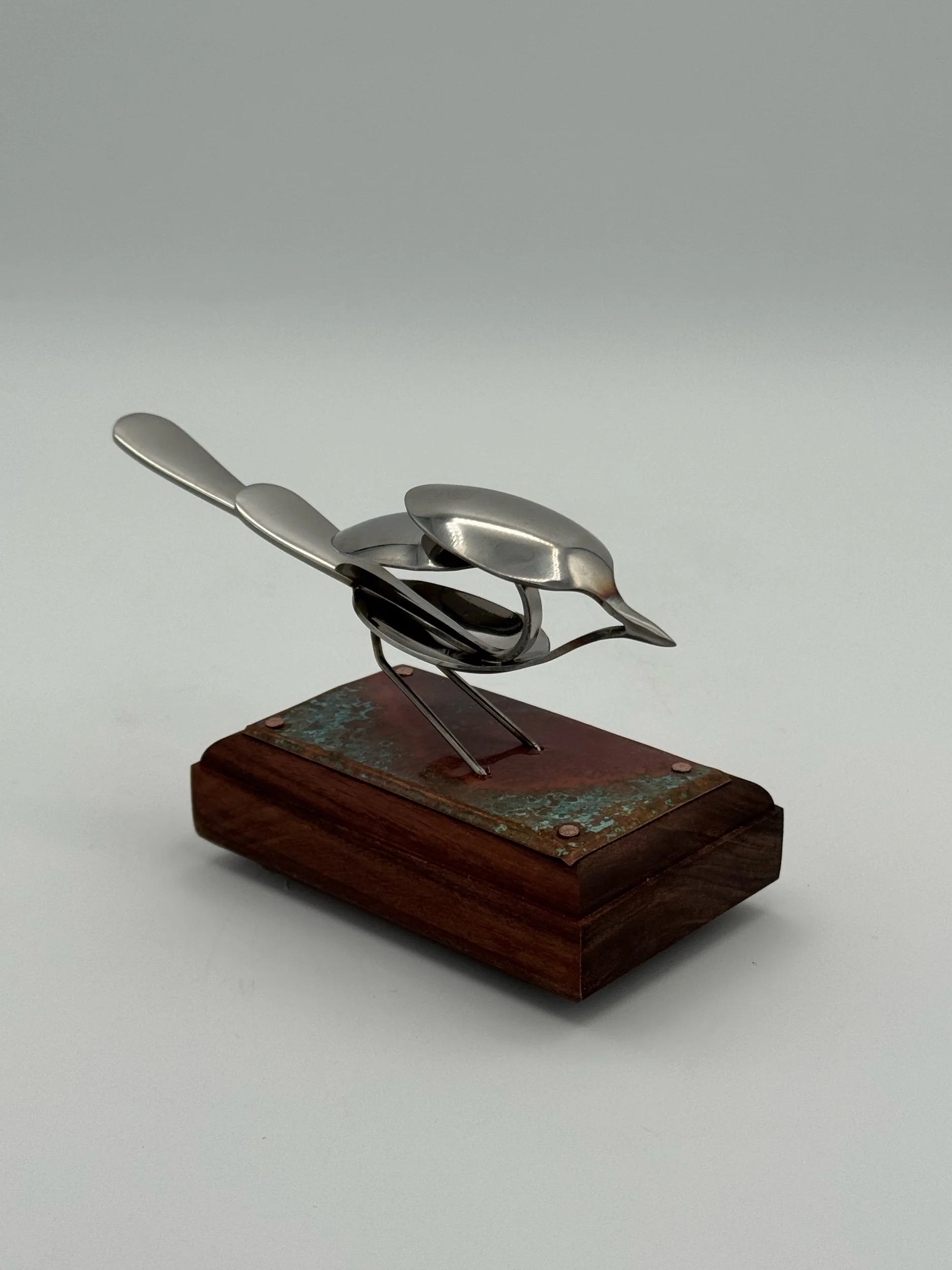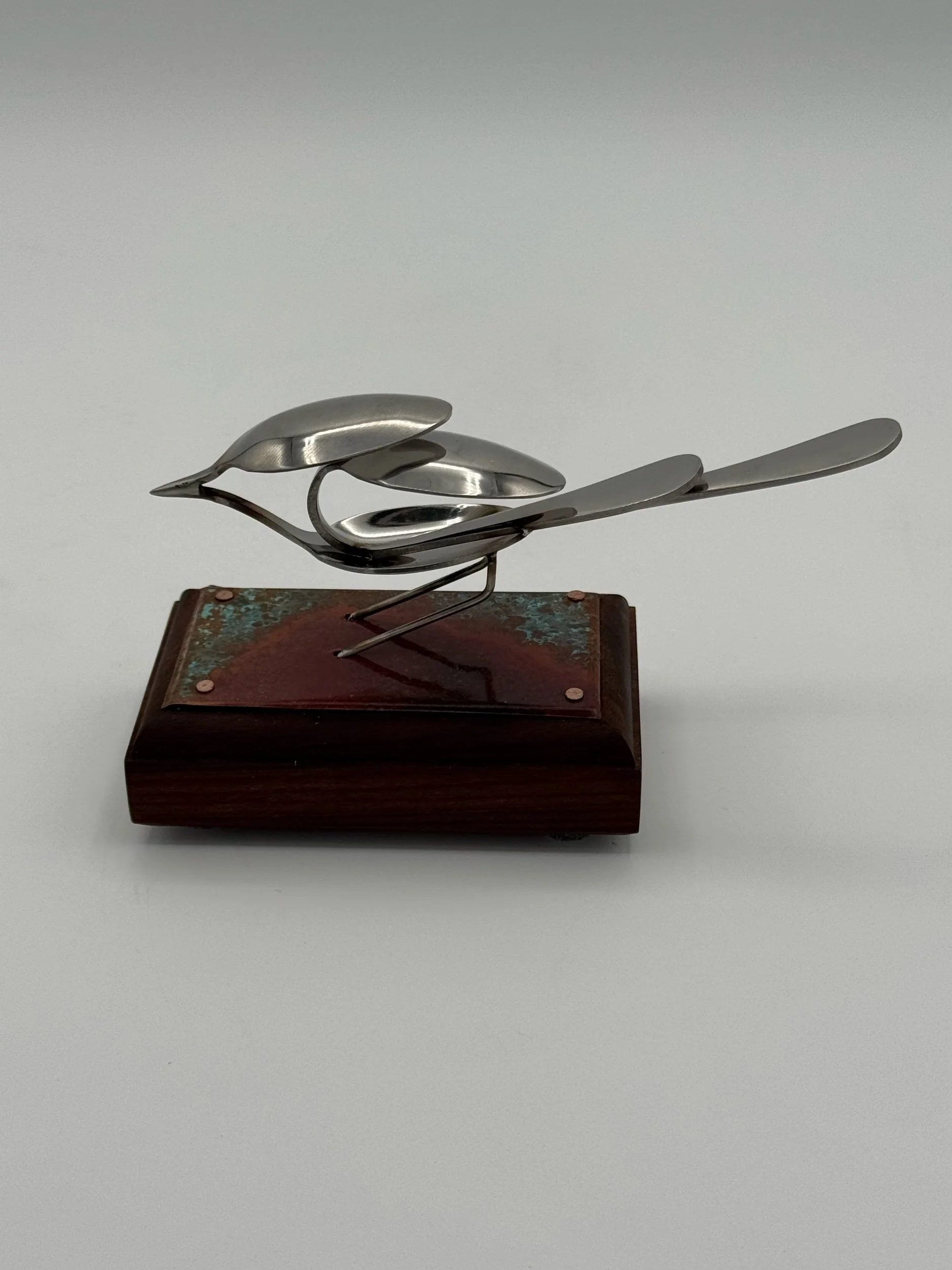 Nestlings are small, elegant bird sculptures made from miniature espresso spoons. This bird is Tig and laser welded with clean precision and attached to a Bolivian Rosewood mount with a blue patina copper surface for a tabletop display. All steel materials used in my pieces are stainless steel, so they will never rust. All metalworking and woodworking are done exclusively by me.