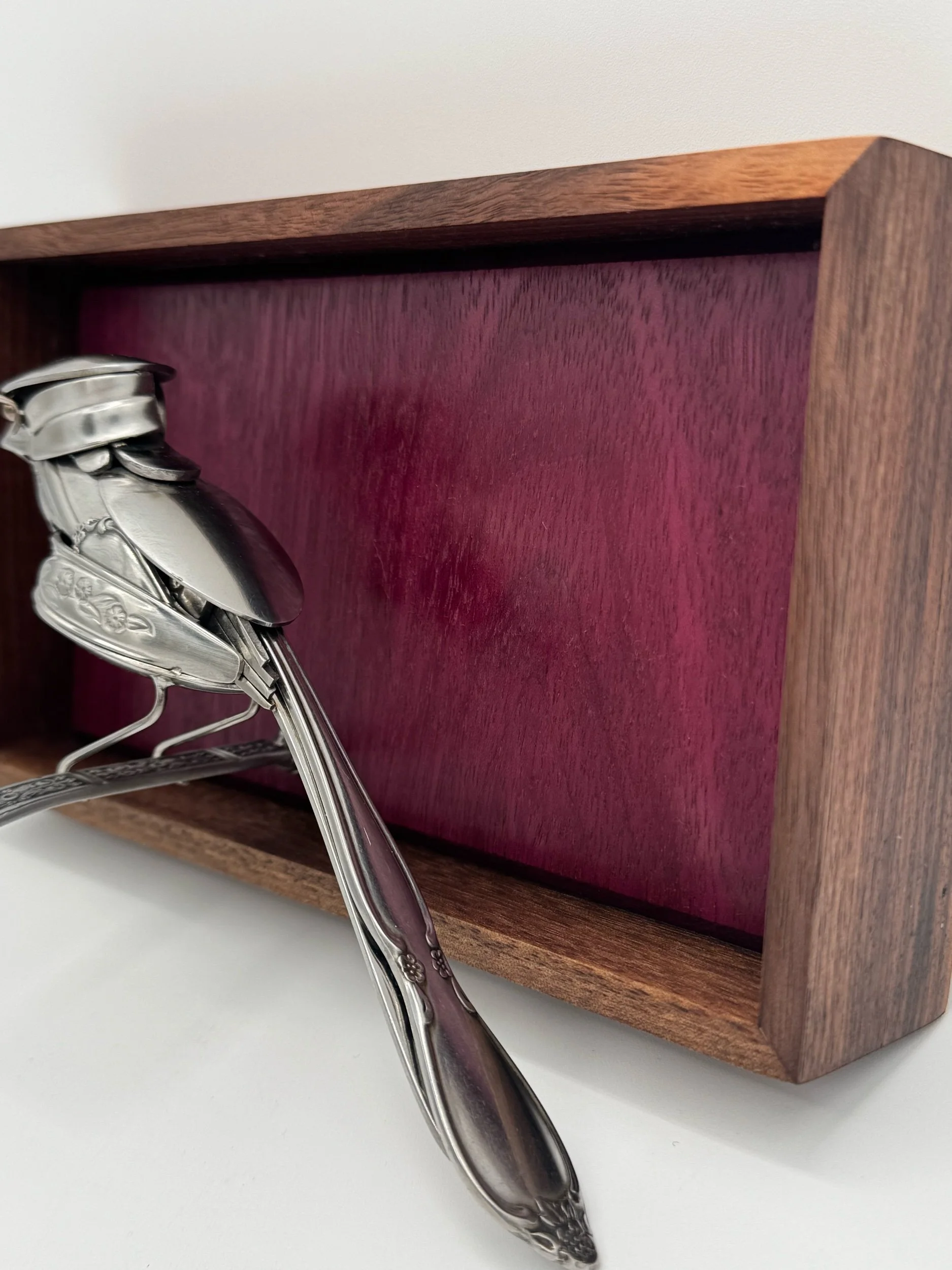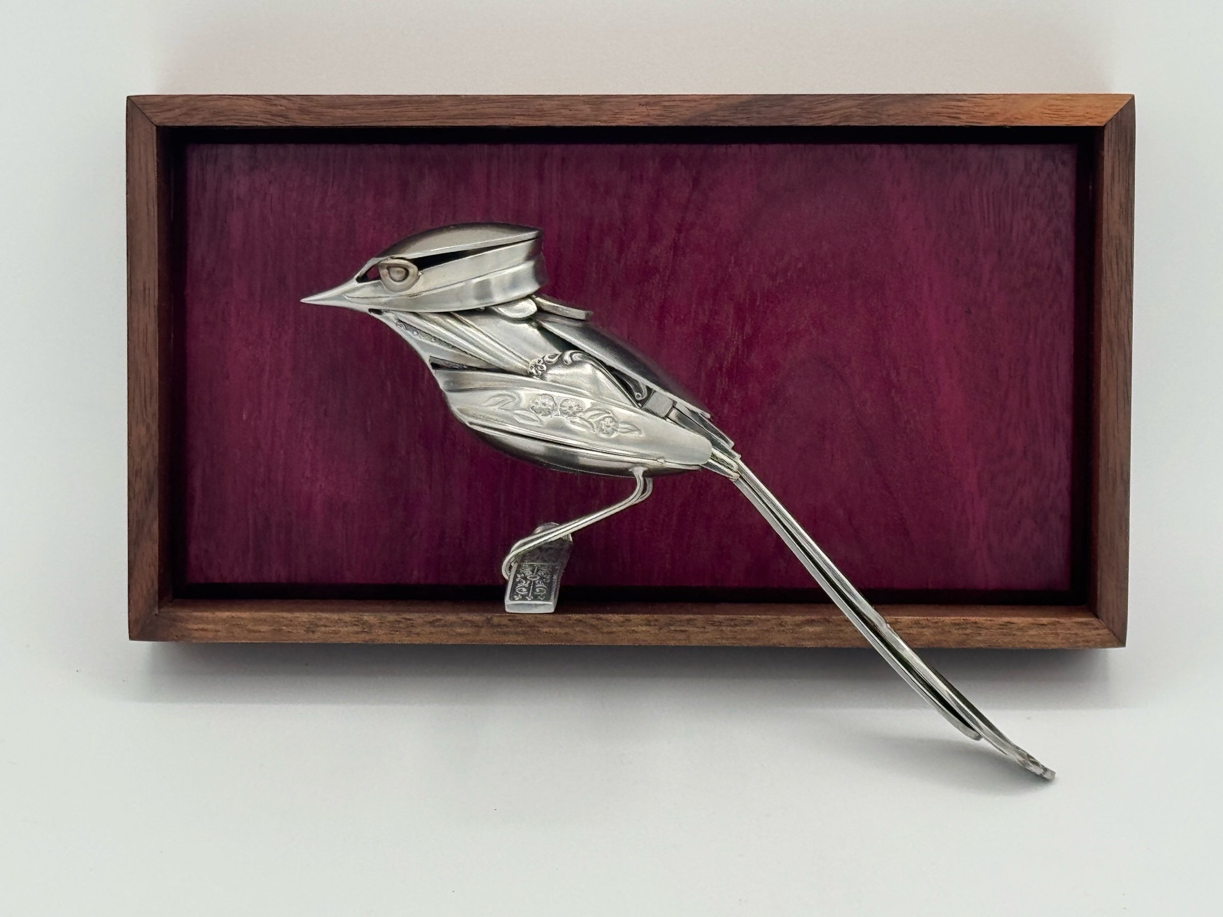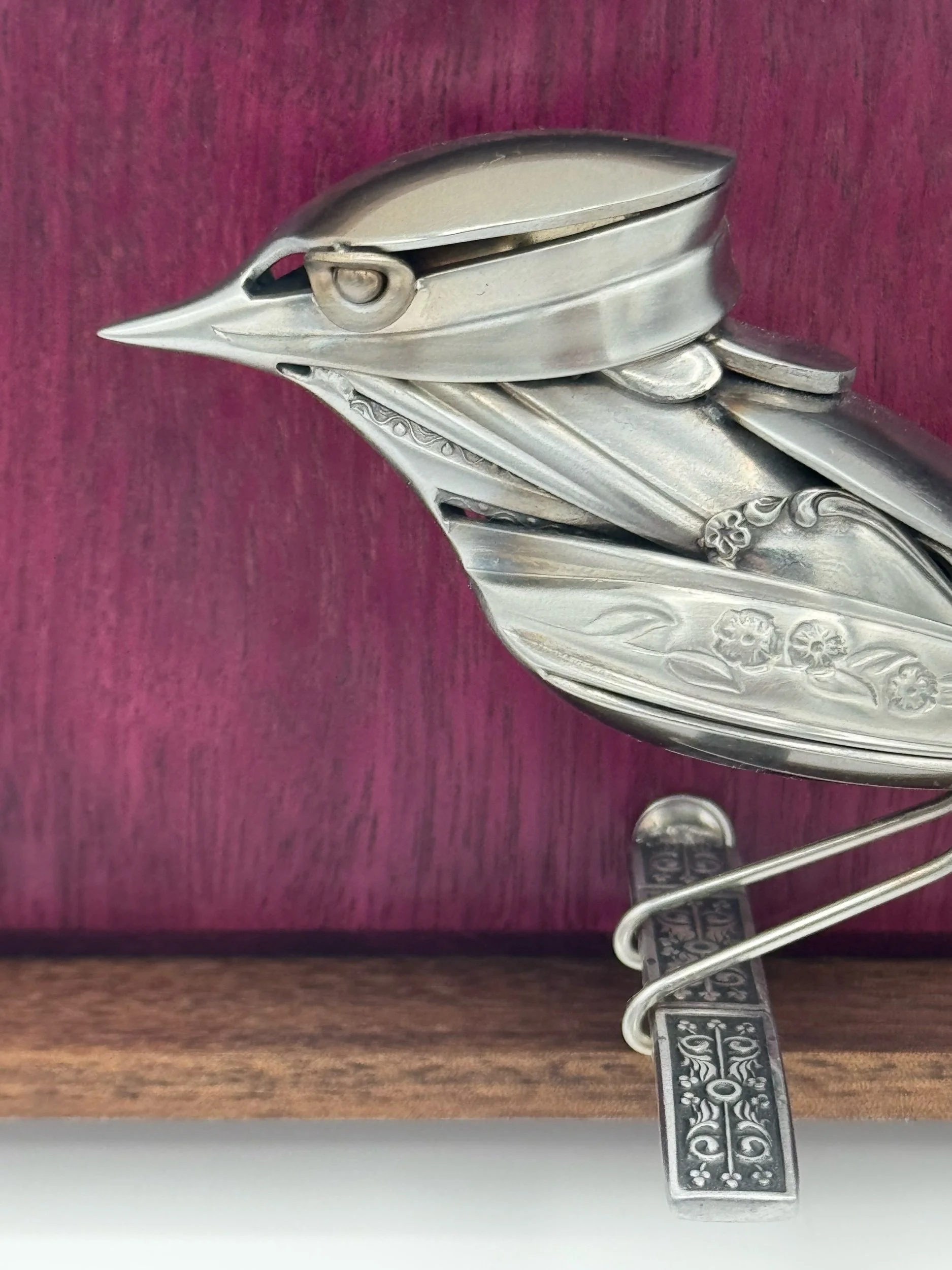 "Holly" is a bird sculpture made from upcycled stainless steel cutlery. The vintage cutlery used in the design focuses on smooth curves and less textured patterns for a streamline appearance.
