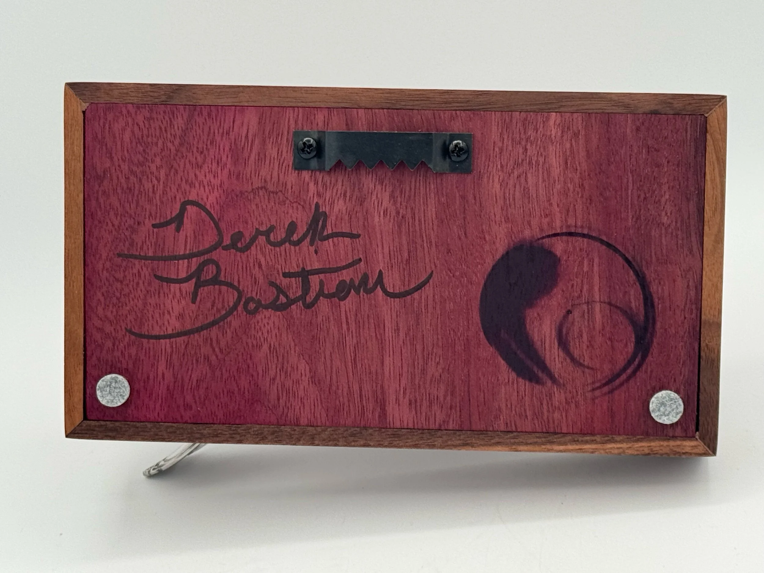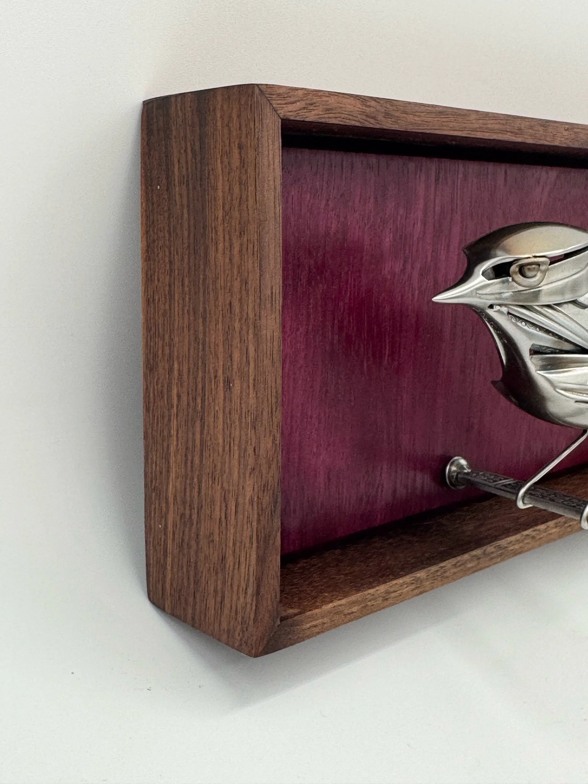 Holly is Tig and Laser welded with clean precision and attached to a Purpleheart wood wall mount with walnut frame