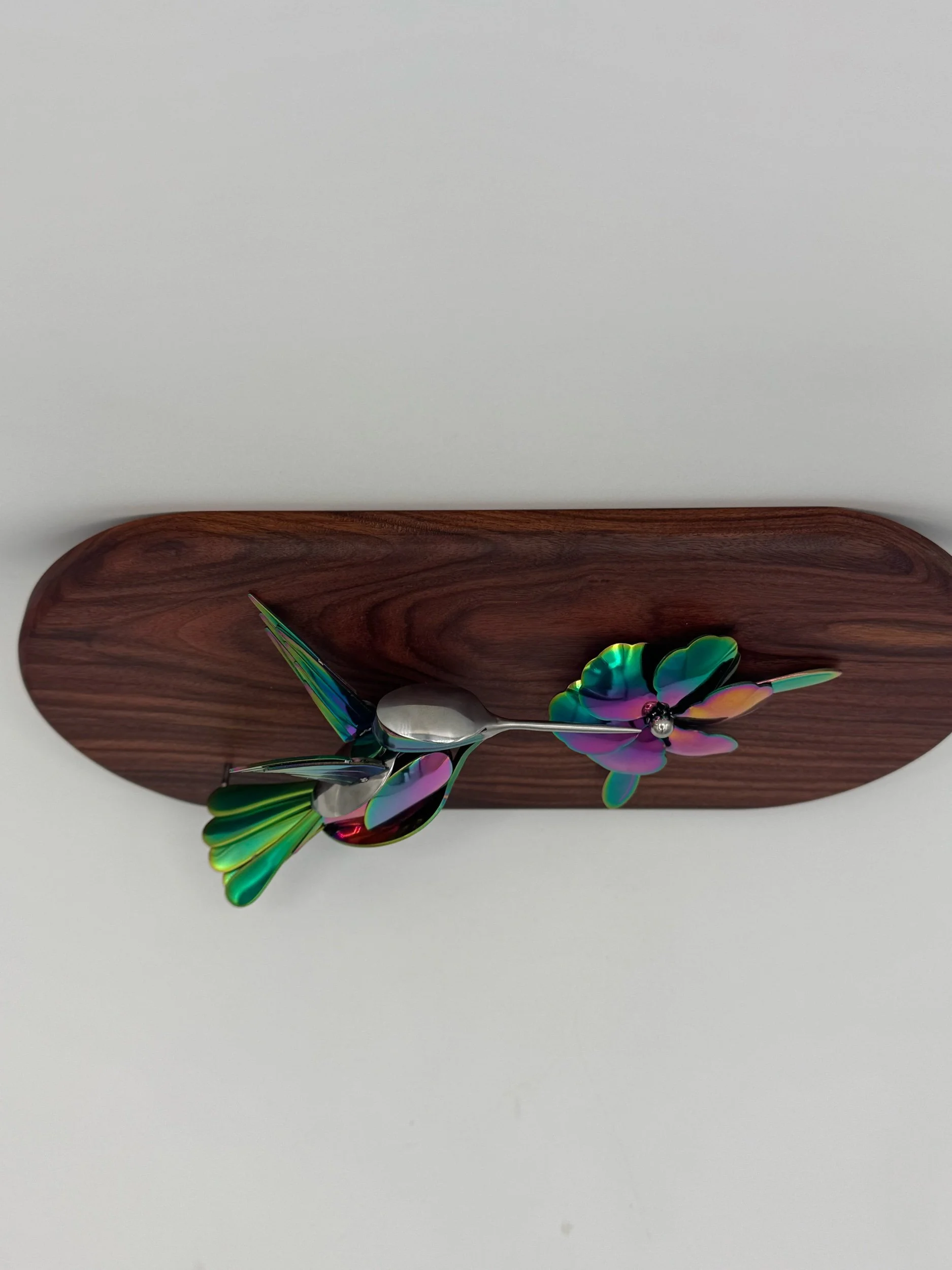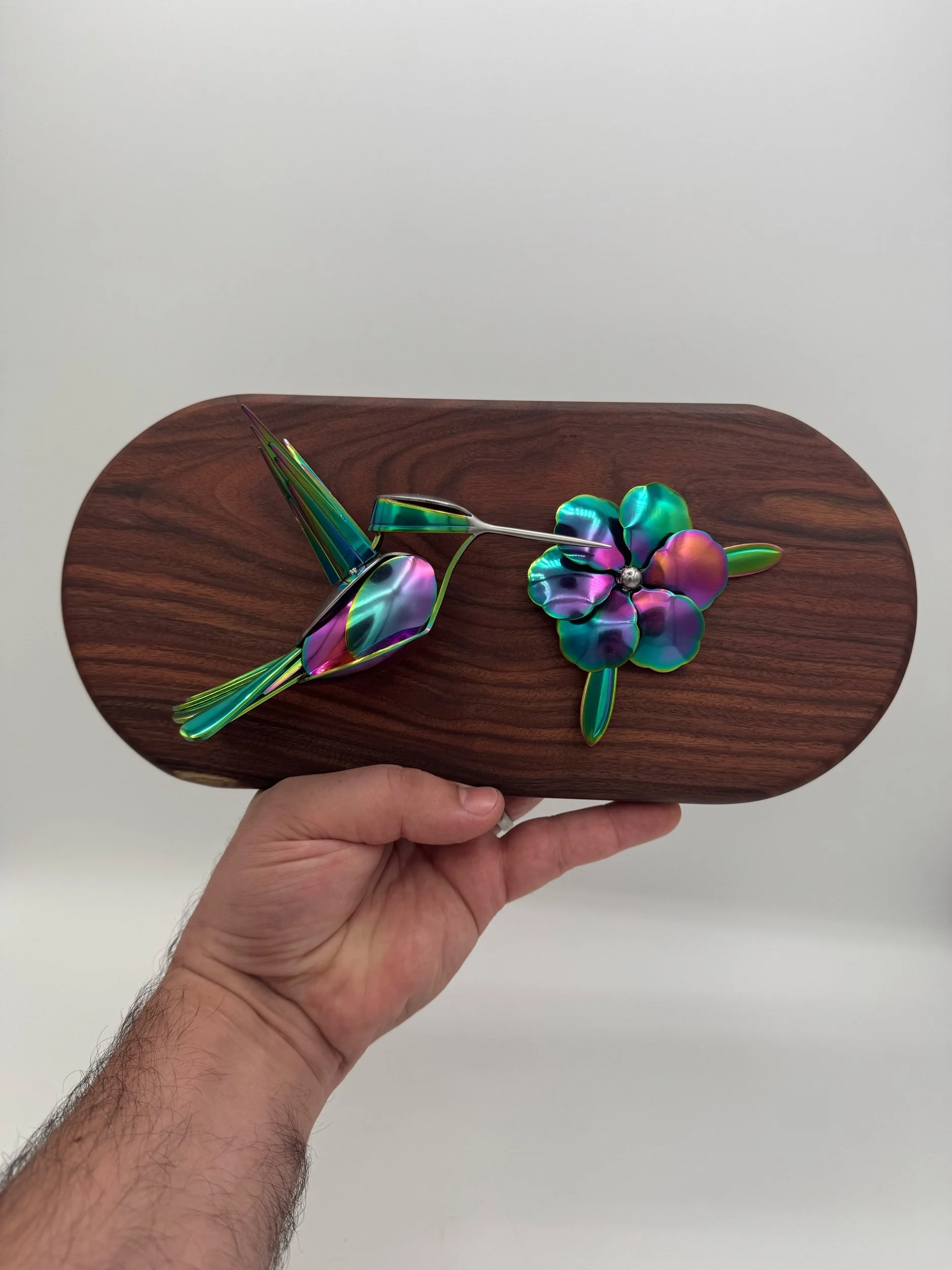 "April" is a Hummingbird sculpture made from upcycled stainless steel cutlery. Made with beautiful rainbow-colored cutlery that shines from every angle.