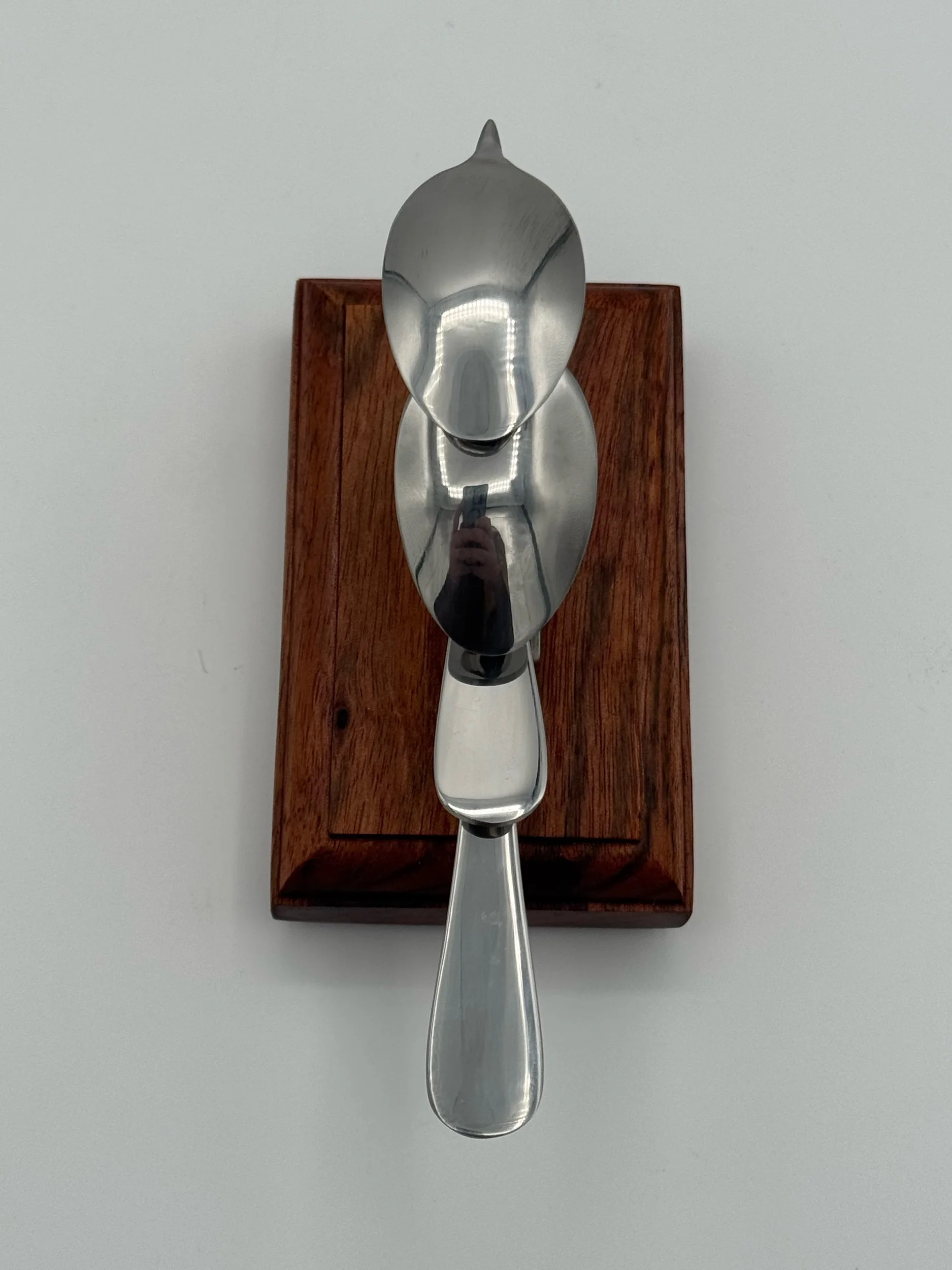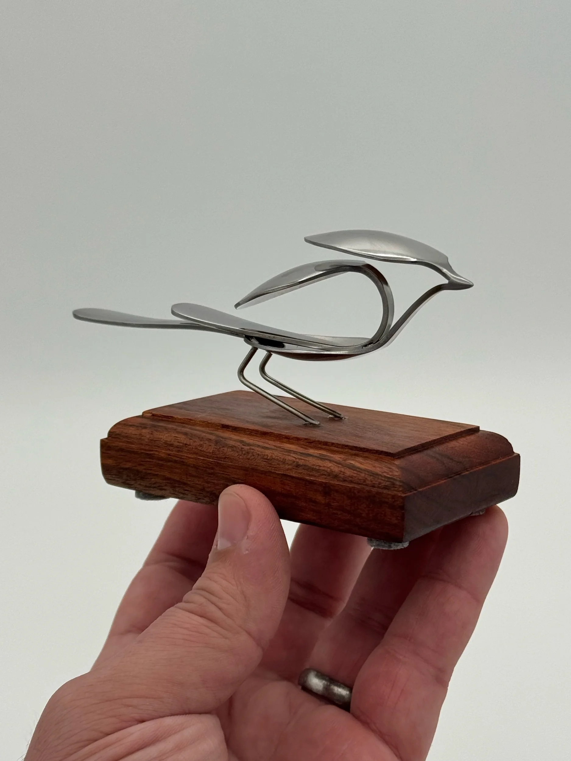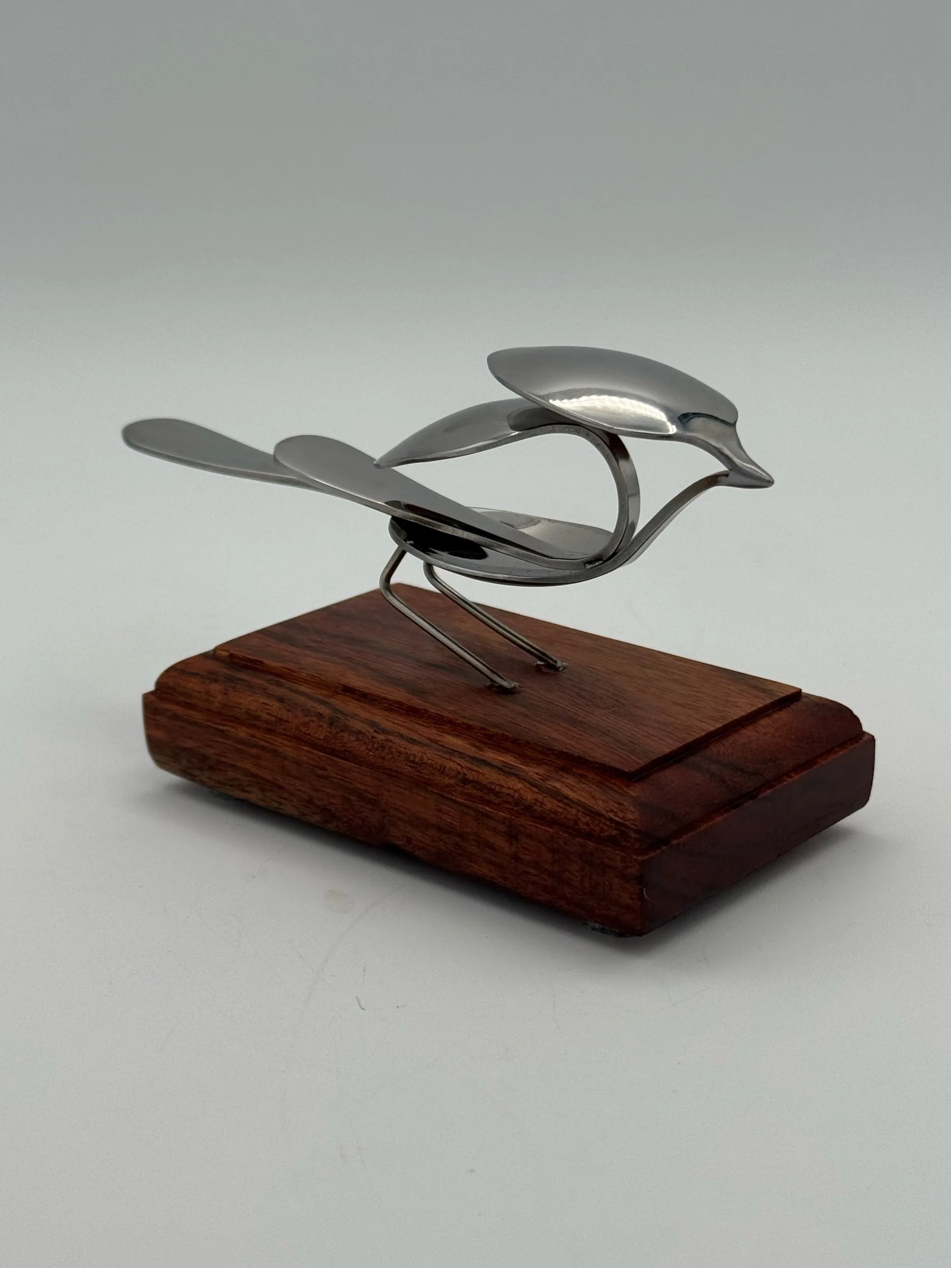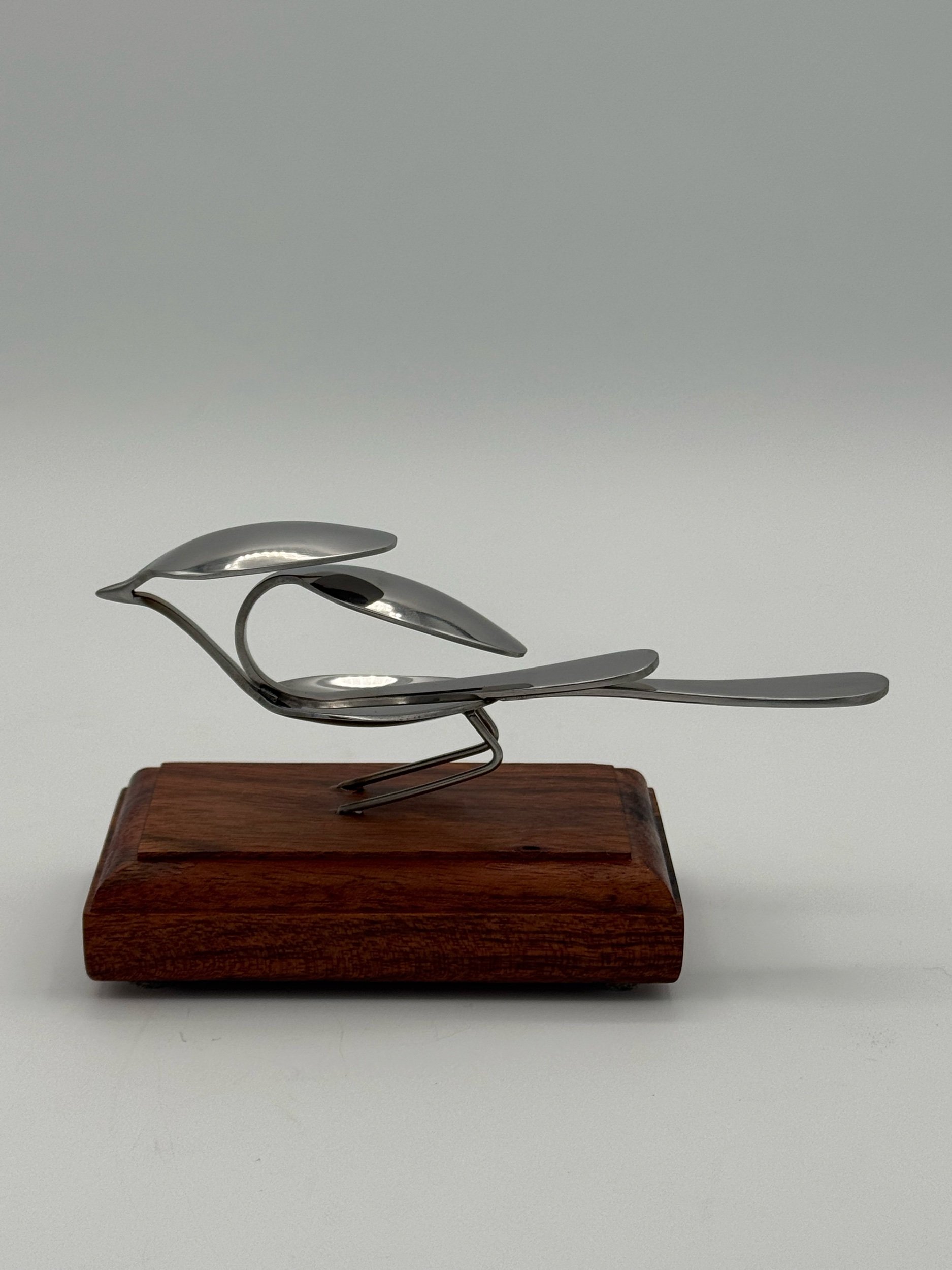 Nestlings are small, elegant bird sculptures made from miniature espresso spoons. This bird is Tig and laser welded with clean precision and attached to a Chechen wood mount for a table top display.