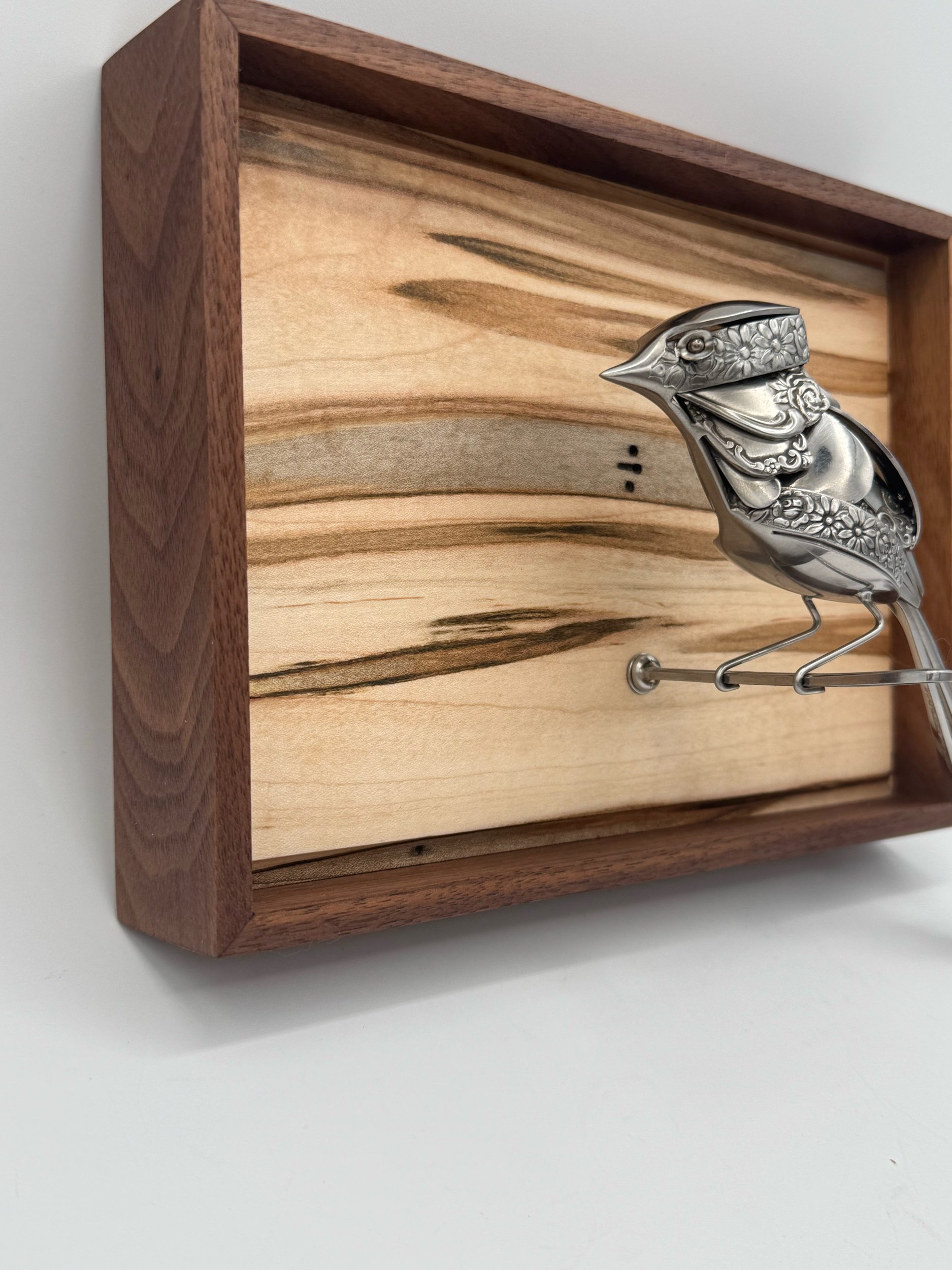 "Ambrose" is a bird sculpture made from upcycled stainless steel cutlery. Featuring heavily-textured ornate floral patterned vintage cutlery.