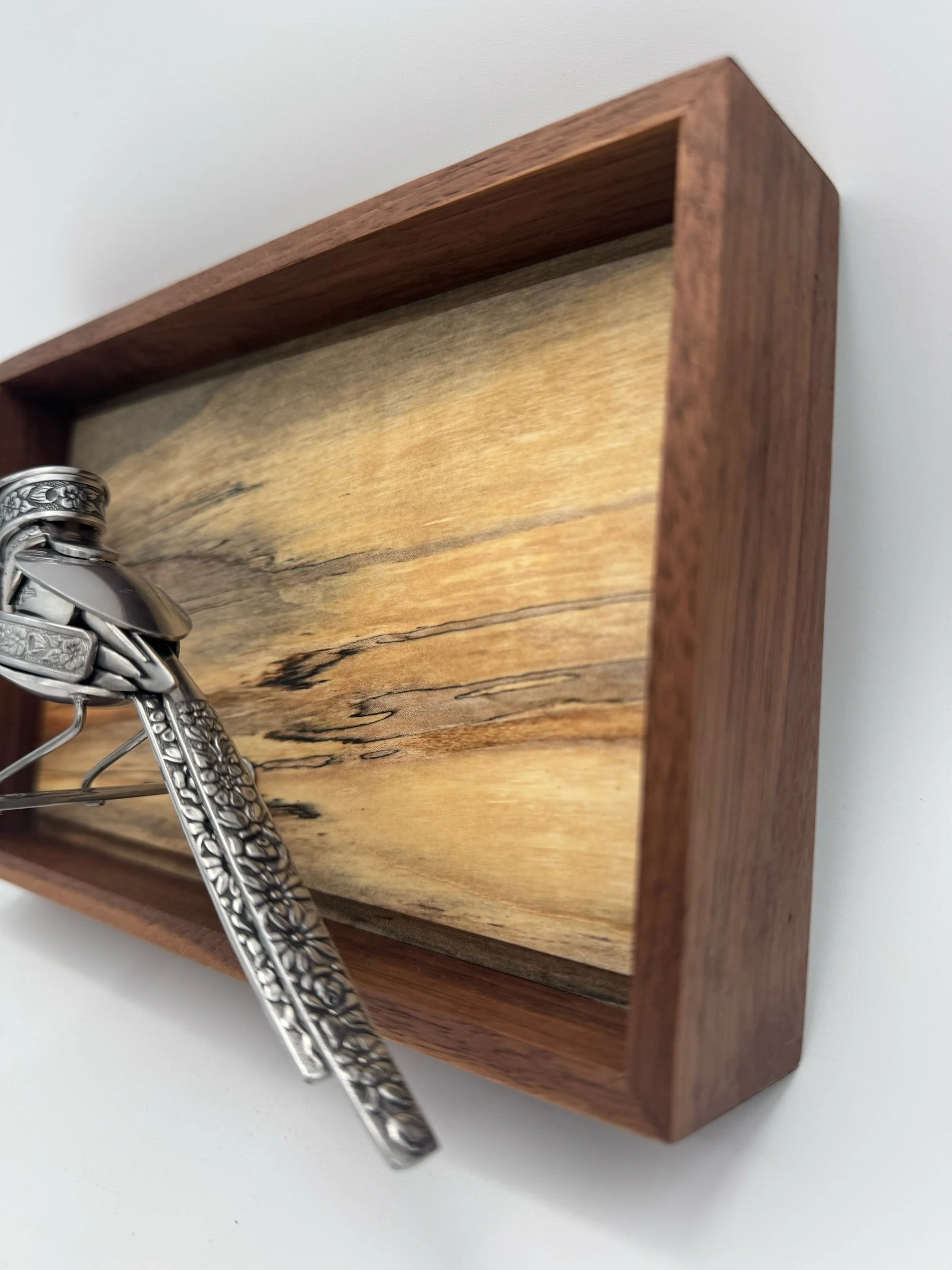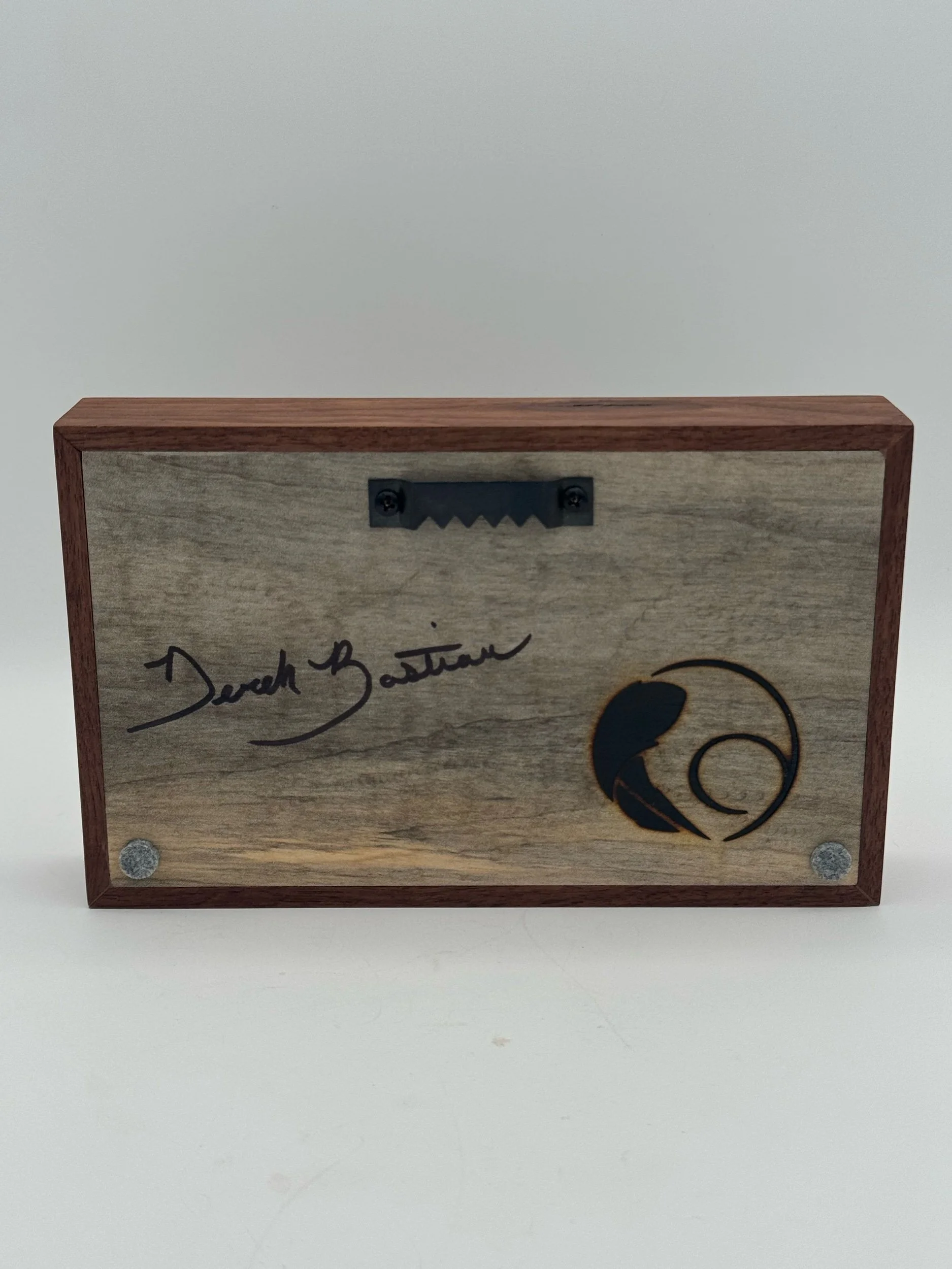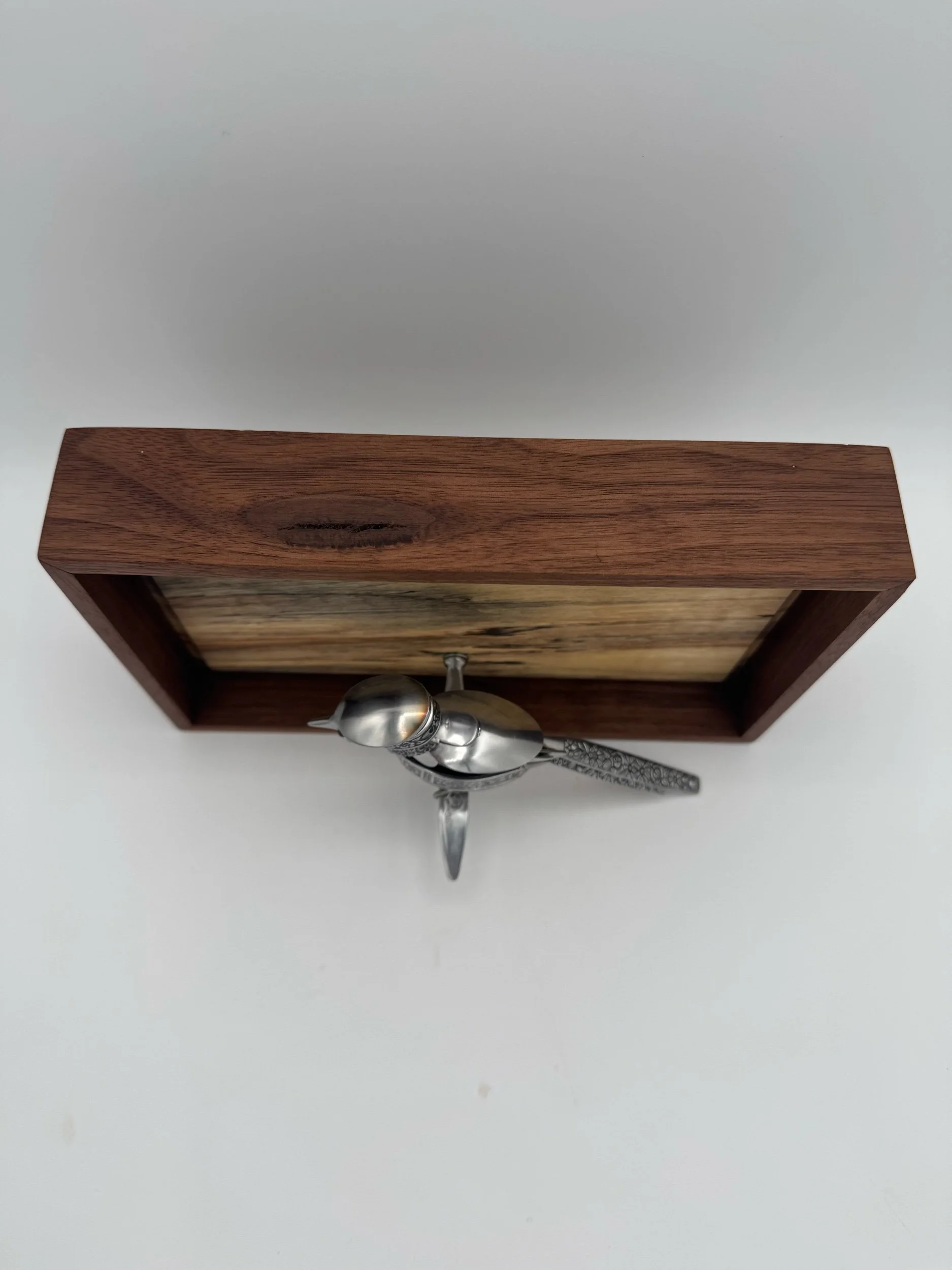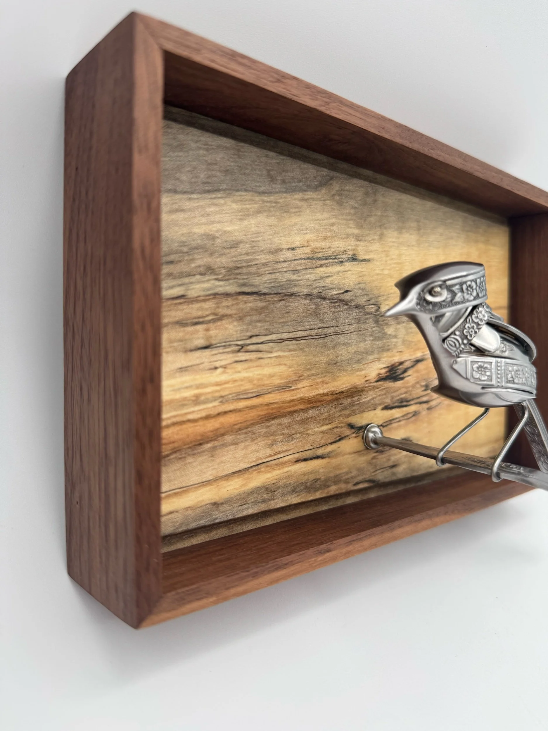 Fern is Tig and Laser welded with clean precision and attached to Spalted Maple wall mount with Walnut frame.