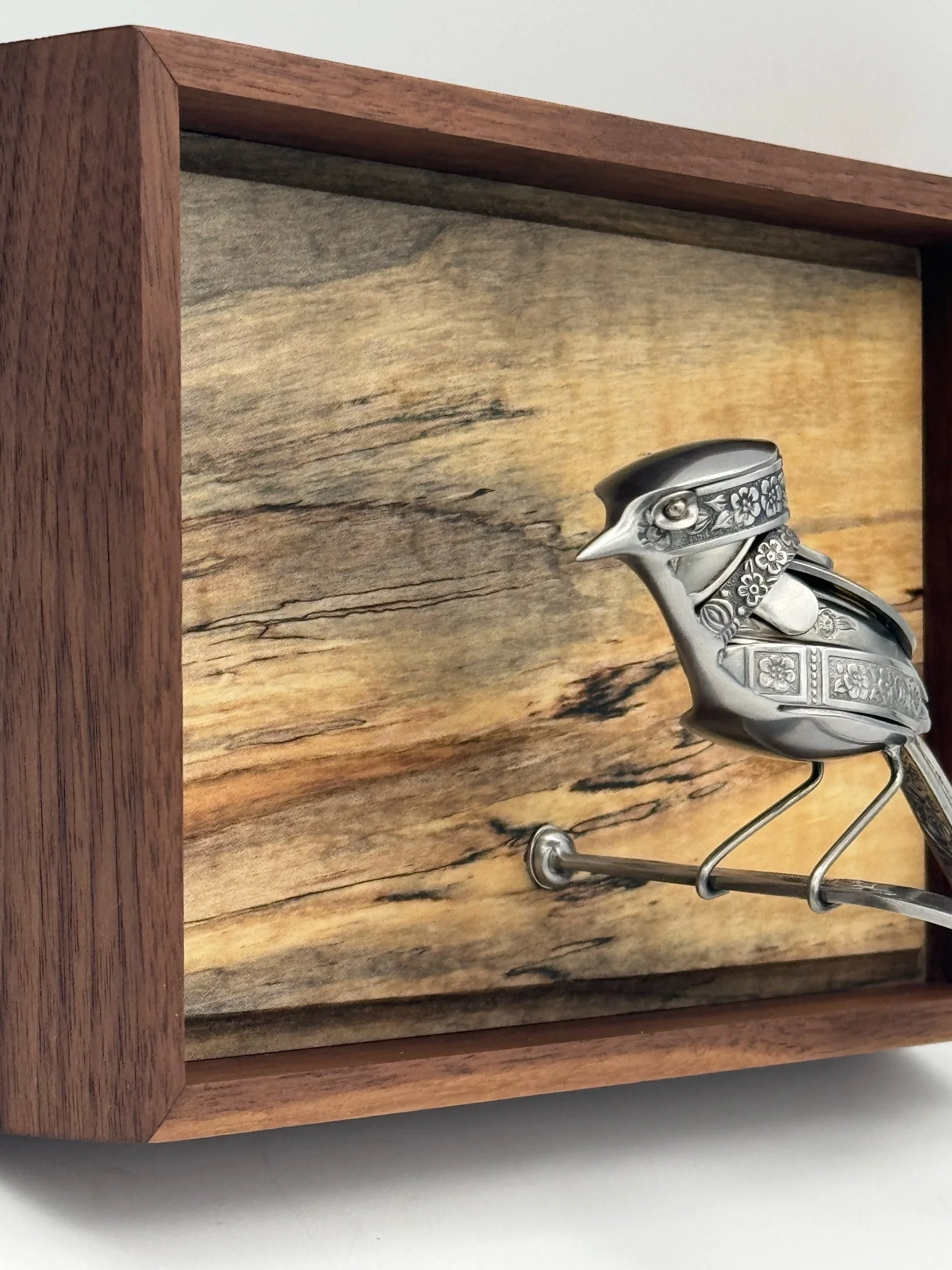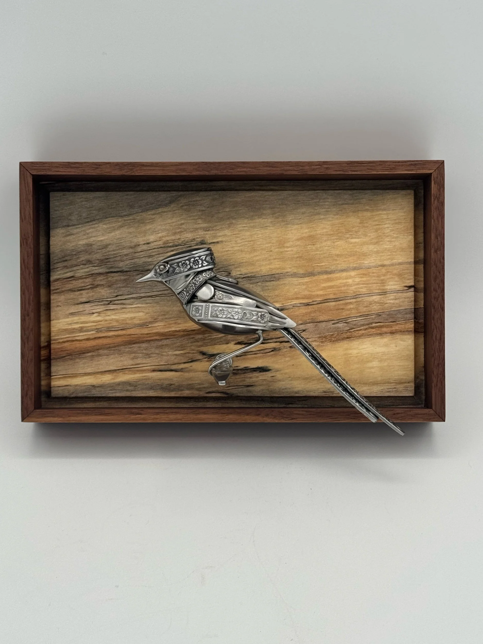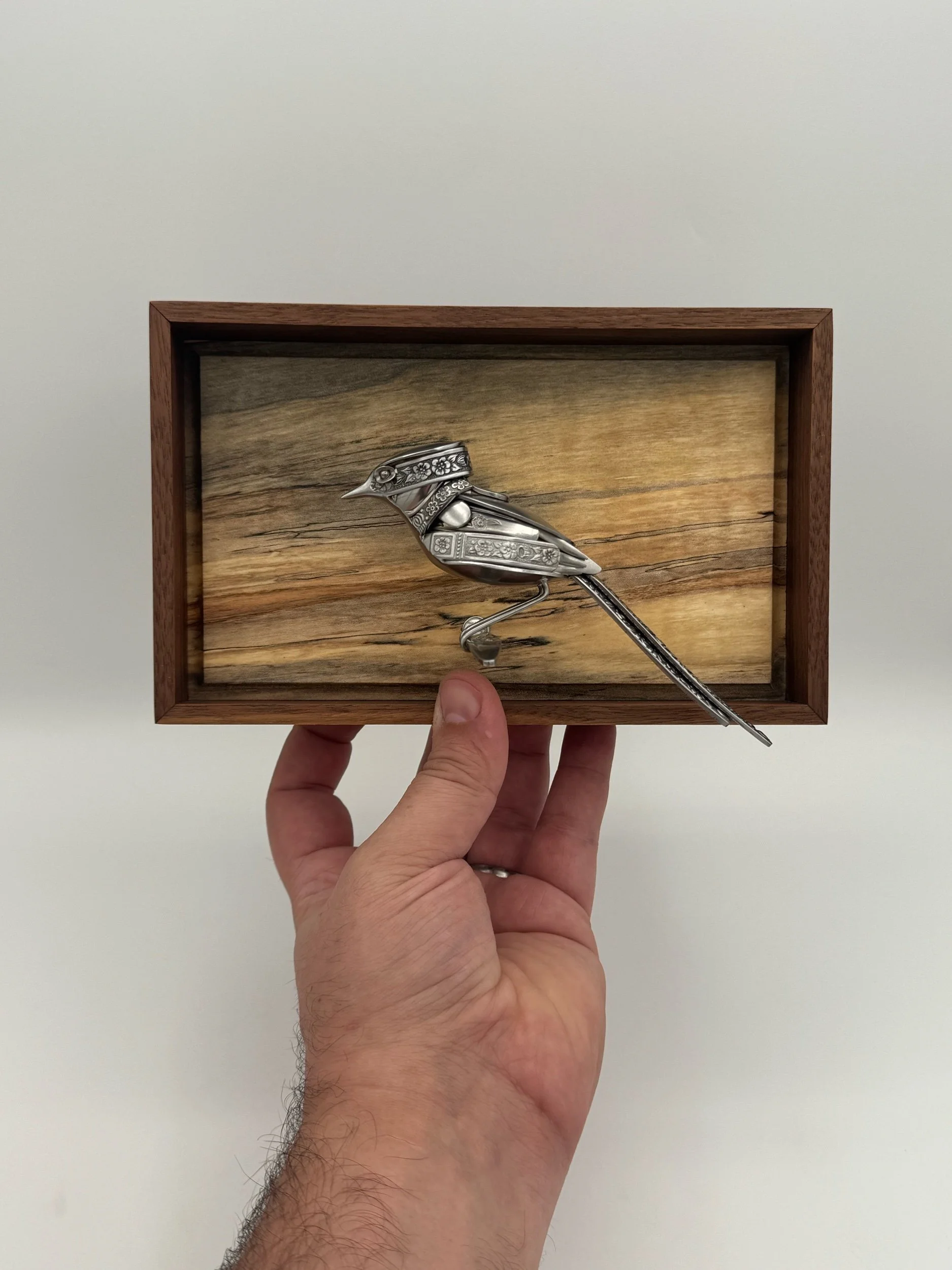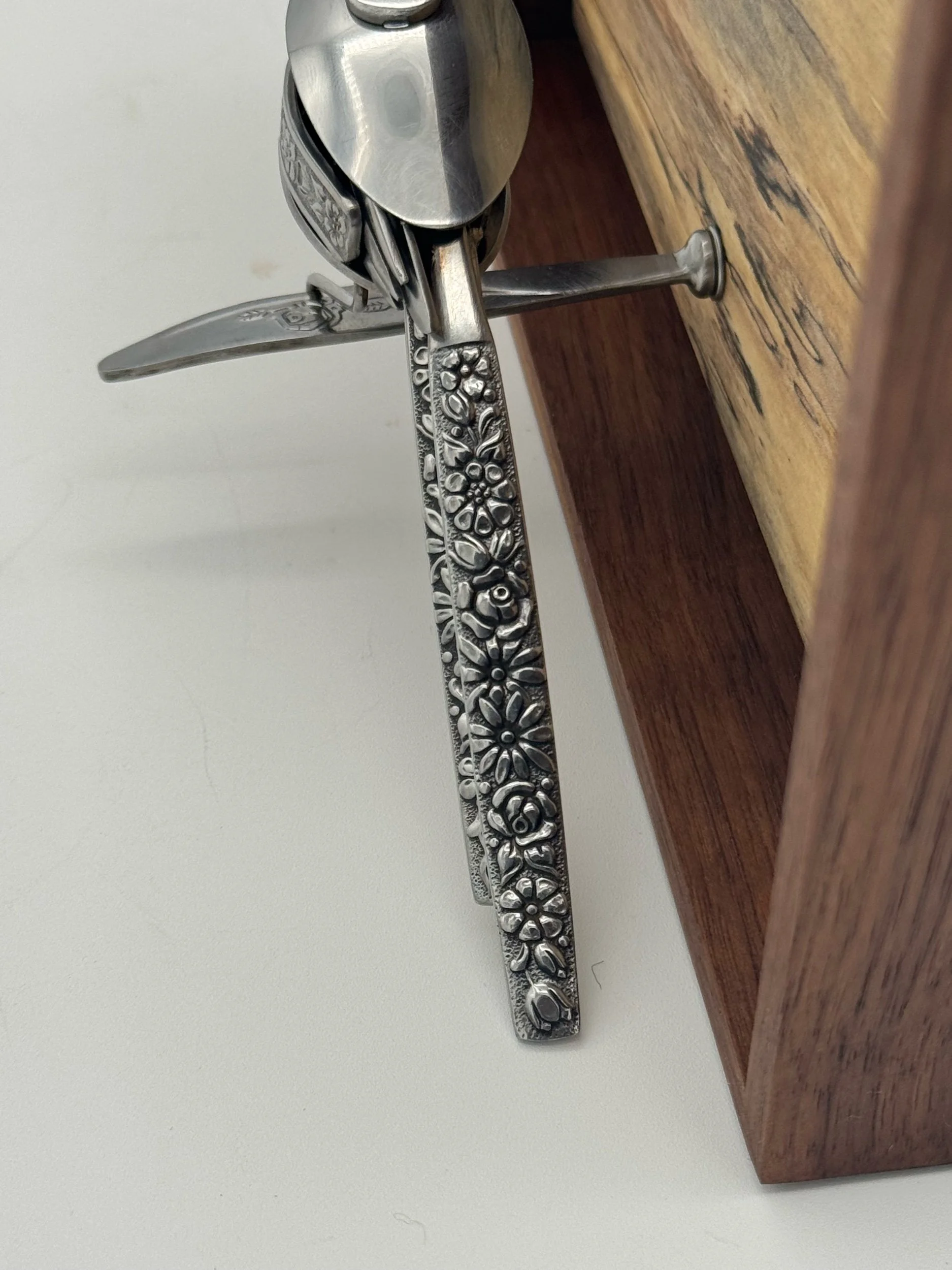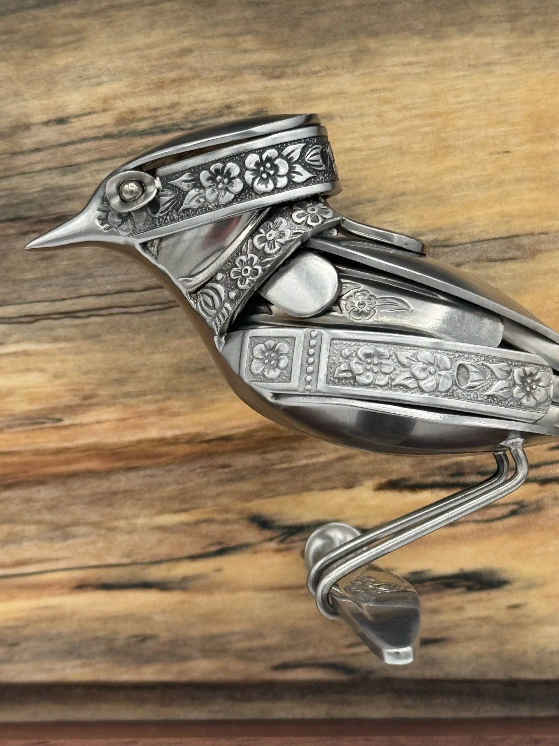 "Fern" is a bird sculpture made from upcycled stainless steel cutlery. Featuring vintage heavily-textured ornate patterned cutlery. This bird was made with a focus on fitting big details into the smallest full-sculpture bird I’ve made to date.
